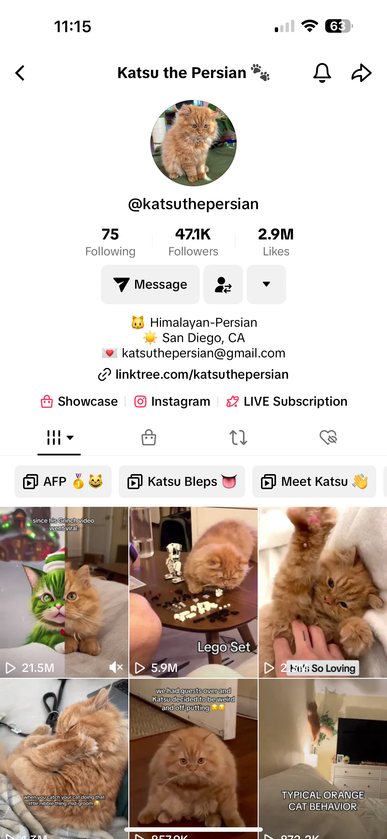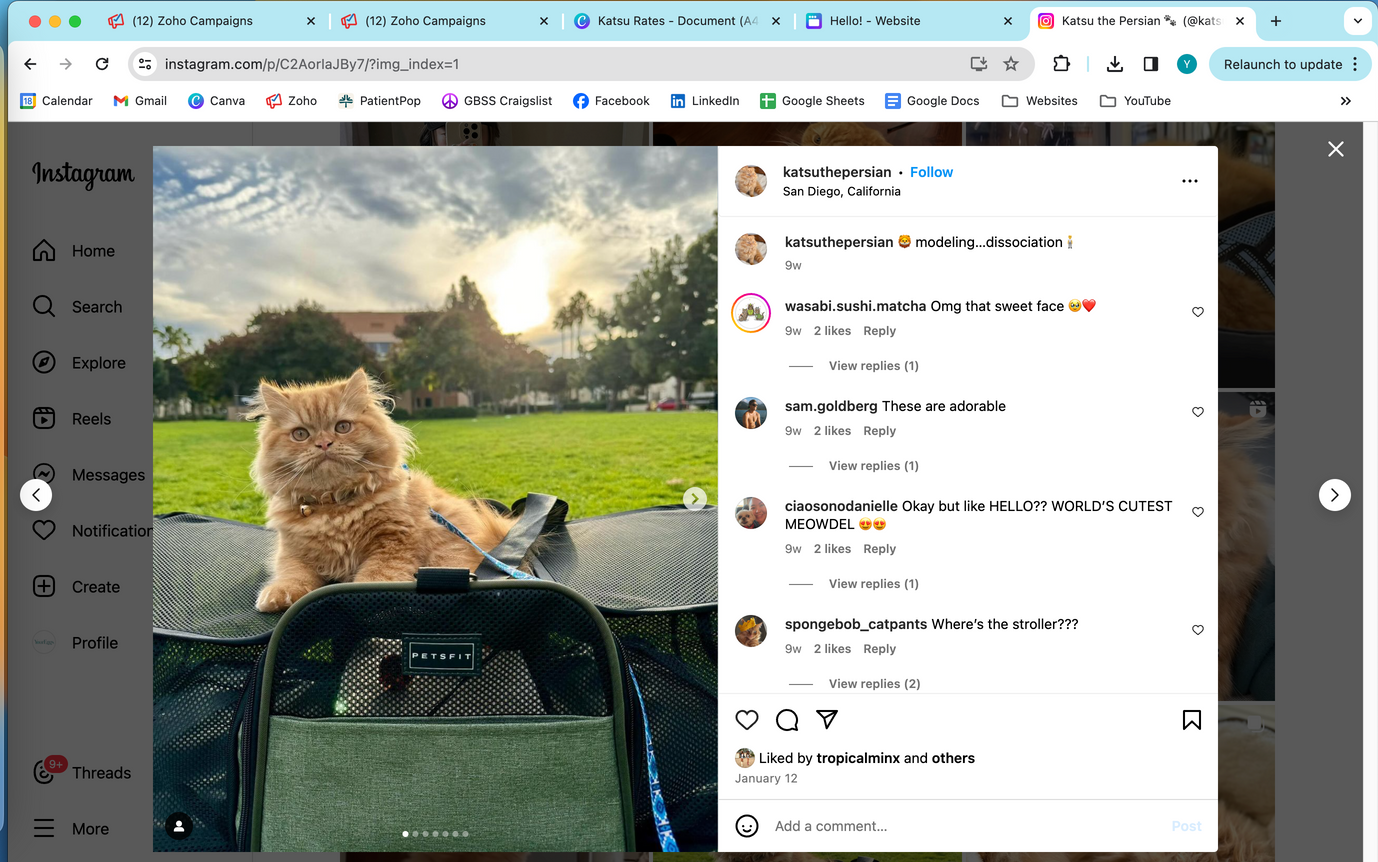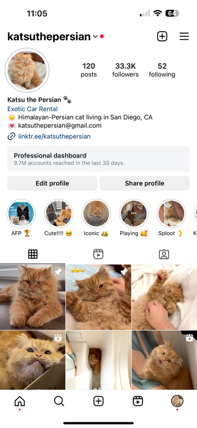 Hello! This is Katsu, a funky orange guy living in San Diego, CA. We adopted him off of Craigslist in 2023. I love connecting with his online community by showing his fun, mischievous, and sometimes awkward personality! I have over 4 years of social media marketing experience and work in corporate marketing.